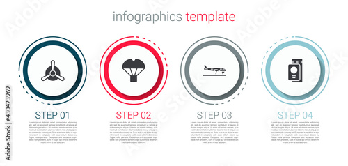 Set Plane propeller, Box flying on parachute, and Passport with ticket. Business infographic template. Vector