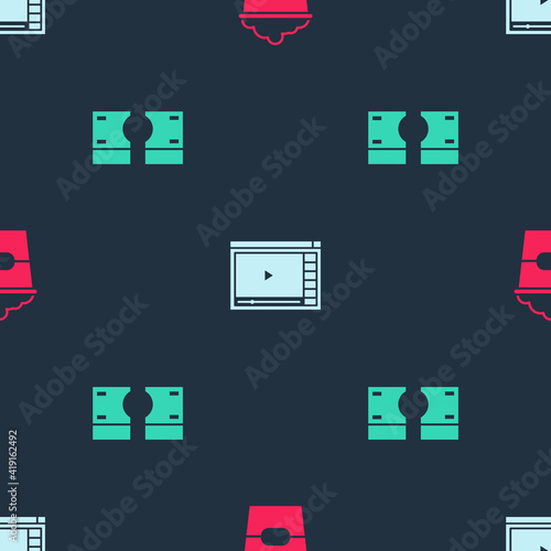 Set Popcorn in box, Online play video and Stacks paper money cash on seamless pattern. Vector.