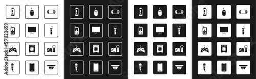 Set Portable video game console, Computer monitor screen, Music player, Battery charge level indicator, Flashlight, mouse, Cinema camera and Gamepad icon. Vector