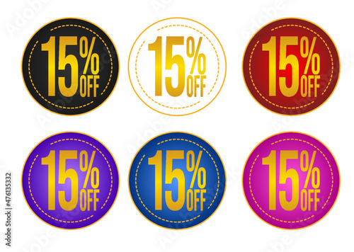 Set sale 15%off banners, discount tags, promotion stickers, vector illustration.