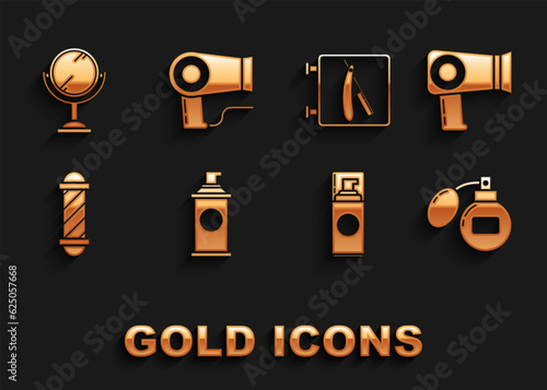gel, foam, shaving, care, shave, beauty, hair, hair drier, drying, vector, icon, isolated, set, gold, gold, black, salon, bottle, cologne, spray, perfume, liquid, container, body, cosmetic, hygiene, illustration, background, pole, symbol, barbershop, shop, signs, vintage, signboard, design, haircut, label, razor, straight, hand, mirror, fashion, glasses, shiny, blowing