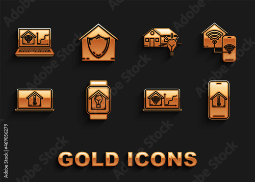 house, bulb, smart, watch, light, technology, wi-fi, wi-fi, wireless, vector, icon, isolated, set, gold, gold, black, control, temperature, home, smartphone, phone, mobile, cold, laptop, computer, security, automation, illustration, heat, thermometer, room, warm, climate, equipment, design, power, energy, symbol, signs, electricity, concept, network, system, cyberspace, app, management, protection
