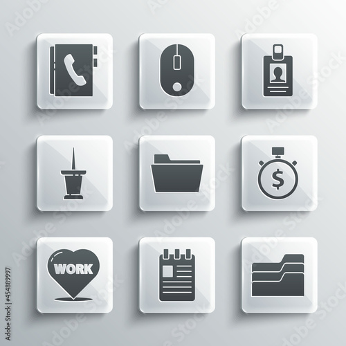 Set Spiral notebook, Document folder, Time is money, Heart with text work, Push pin, Address and Identification badge icon. Vector