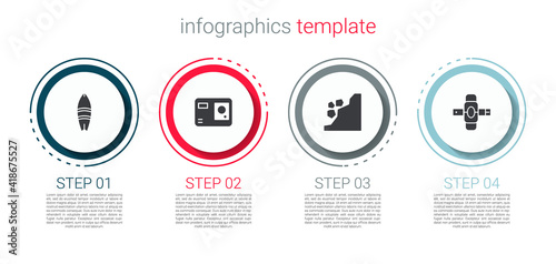 Set Surfboard, Action extreme camera, Landslide and Knee pads. Business infographic template. Vector.