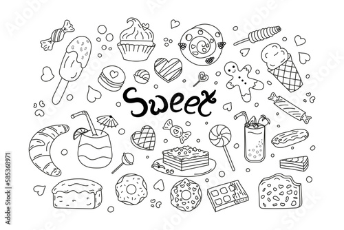Set sweets doodle. Black and white line Vector illustration. Food Sweets, dessert, chocolate, cakes.