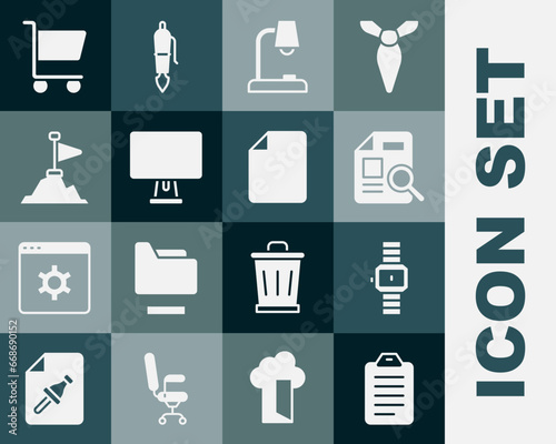Set To do list or planning, Wrist watch, Document with graph chart, Table lamp, Computer monitor, Mountains flag top, Shopping cart and File document icon. Vector