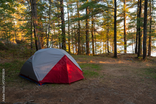 Set up campsite with a tent on the shore of the lake with the sun rays glowing through pine trees. Camping, outdoors, backcountry adventure concept.
