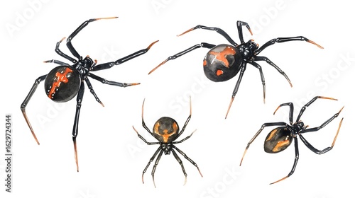 set watercolor of black widow, spider illustration is drawn on an isolated white background