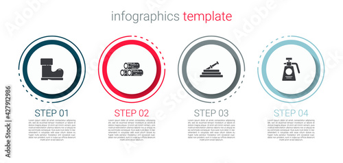 Set Waterproof rubber boot, Wooden logs, Garden hose or fire hose and sprayer for fertilizer. Business infographic template. Vector