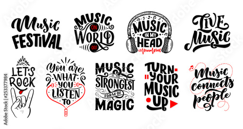 Set with inspirational quotes about music. Hand drawn vintage illustration with lettering. Phrases for print on t-shirts and bags, stationary or as a poster.