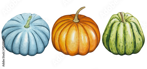 Set with pumpkins, green, orange, blue, watercolor illustration