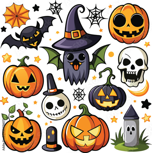 halloween, pumpkin, autumn, bat, vector, night, holiday, moon, horror, illustration, scarey, tree, skittish, october, dark, sorcerer, celebration, design, silhouette, black, cartoon, orange, ghost, set, fear