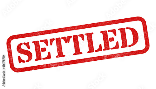 settled, rubber stamp, word, red, stencil, seal, ink, realistic, isolated, vintage, distressed, grunge, old, print, text, written, effect, layer, overlay, textured, mark, worn, eroded, label, signs, sticker, rectangle, certified, block, border, contour, organic