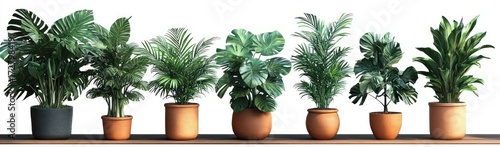 Seven potted tropical indoor plants with lush green leaves arranged in a row on a wooden surface against a white background