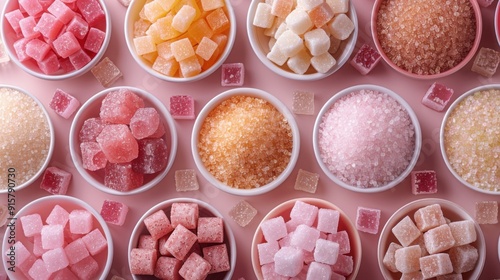 Several bowls of sugar cubes and sugar cubes are arranged in rows