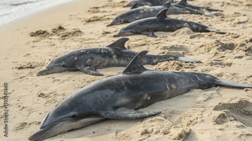 Several dead dolphins lie on the sandy shoreline after a mass stranding