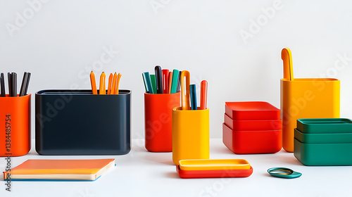 Several desktop organizers lined up, with one in a bold and bright color, white background