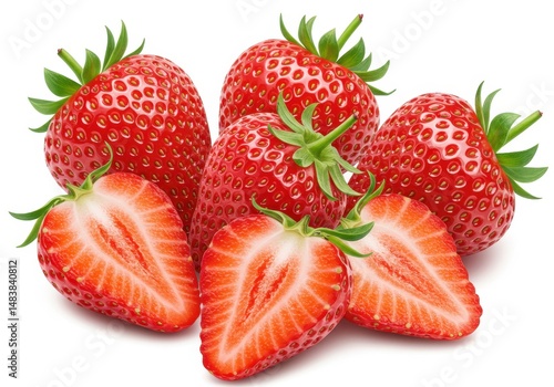 strawberry, fruit, red, fresh, berry, food, healthy, sweet, ripe, cut, halved, ingredient, raw, vitamin, delicious, nourishment, isolated, background, white, leaf, green, plant, closeup, macro, studio, produce, dessert, organic, juicy, vegetarian