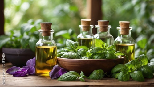 Several glass bottles, likely containing essential oils, are arranged amongst various fresh basil leaves.