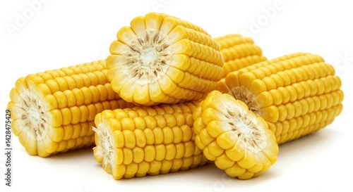 corn, corn on the cob, yellow, food, vegetable, kernel, cob, cut, sliced, agriculture, healthy, fresh, raw, ingredient, vegetarian, vegan, nourishment, maize, produce, harvest, ripe, sweet corn, isolated, white background