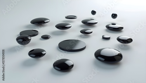 Several smooth, black, reflective droplets and disc shapes are scattered across a light gray surface, some appearing to float slightly above it.