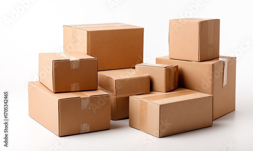 Several stacked cardboard boxes of various sizes, taped shut, against a plain white background