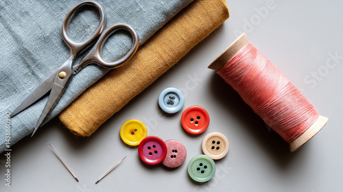 Sewing project flat lay with fabric, scissors, and colorful buttons for craft inspiration
