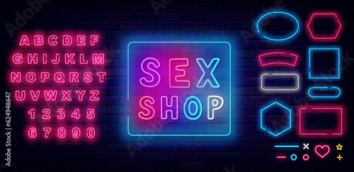 Sex shop neon label on brick wall. Multicolored handwritten text. Frames collection. Vector stock illustration