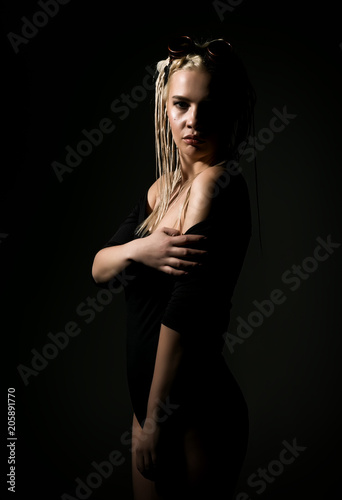 sexy blonde woman with dreadlocks and welding glasses on a dark background in the studio
