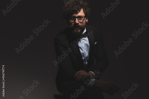 sitting, seated, chair, resting, arm, cool, attitude, style, eyeglass, goggles, latin, moustache, moustache, beard, long, hair, curly, man, businessman, model, groom, bridegroom, people, business, fashion, tuxedo, bow tie, bow tie, young, photogenic, attractive, sexy, elegant, looking, wearing, holding, hand, smiling, happy, grey, grey, black, studio, background