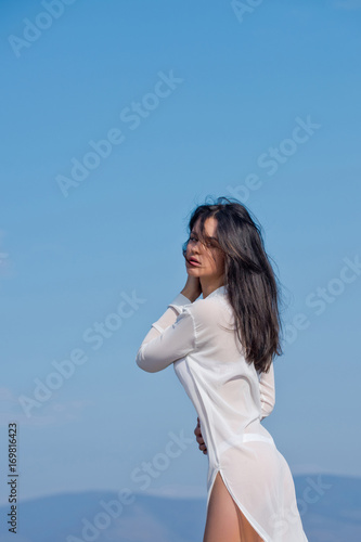 woman, brunette, hair, fresh, make-up, girl, cute, face, beauty, fashion, sexy, model, blue, sky, background, fashionable, long, pretty, adorable, beautiful, sexy woman, sexy girl, summer, sunny, make up, young, youth