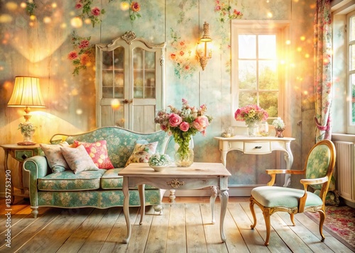Shabby Chic Interior: Double Exposure of Floral Wallpaper & Vintage Furniture
