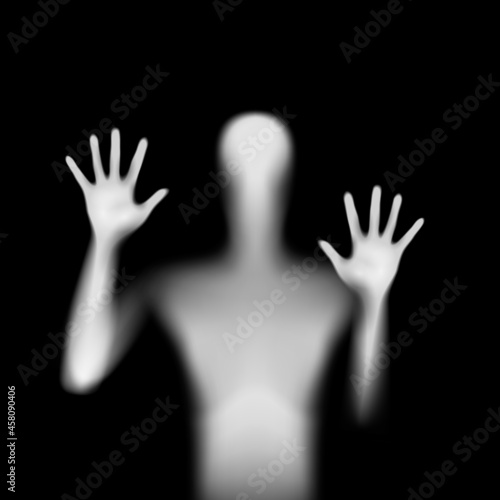 Shadow Blur of Horror Man Behind the Matte Glass. Blurry Hand, Body Figure Abstraction, and Two Palms. The Reflection of the Silhouette Through the Light. Illustration on Black Backdrop