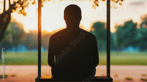 Shadow figure sitting on a swing in an empty park, dusk setting, illustrating loneliness and depression, 3D illustration