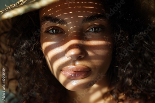 woman, shadow, pattern, face, hat, sunlight, closeup, natural light, beauty, curly hair, portrait, warm light, serene, skin, peaceful, textured, sunlit, eye, lip, contemplative, summer, calm, aesthetic, elegance