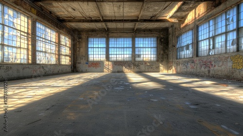 Shadows of the Past: Abandoned Warehouse with Graffiti-Covered Walls and Broken Windows Waiting for Rebirth