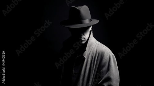 Shadowy black and white portrait capturing hardboiled detective wearing fedora, silhouetted against dark background with intense film noir styling