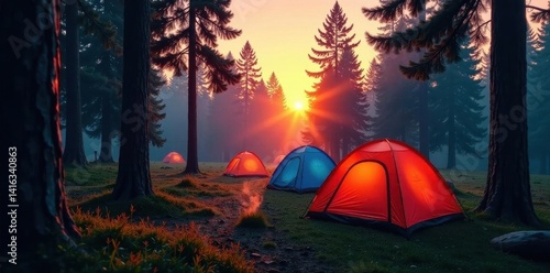 Shadowy conifer forest, colorful camp tents at dawn , sunrise, camping, conifer