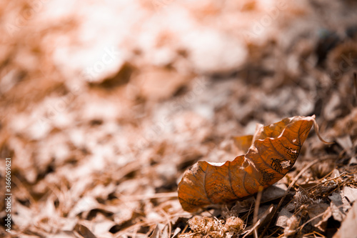 Shallow depth of field shot of Brown dry leaves pile on the ground