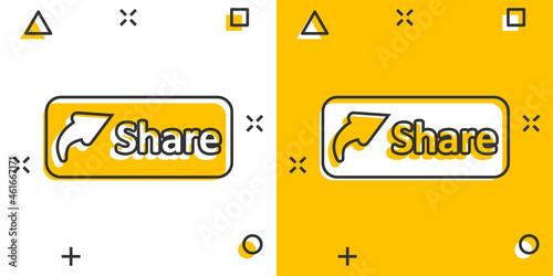 Share button icon in comic style. Arrow cartoon sign vector illustration on white isolated background. Send file splash effect business concept.