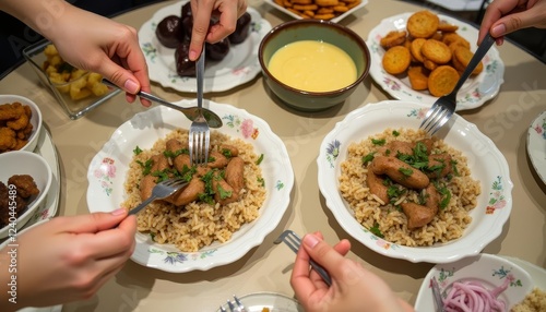 meal, sharing, friends, food, dinner, lunch, gathering, table, rice, sausage, hand, fork, plate, dish, snack, dessert, sauce, bowl, pastry, fried, appetiser, vegetable, presentation, casual attire, dining, togetherness, celebration, family, cookery, diverse, social, interaction, culinary, enjoyment, lifestyle, home, cooked, prepared, indoor, human, connection, nourishment, eat