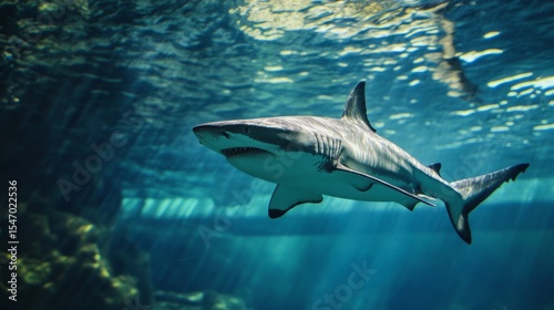 Shark swimming calmly but aimlessly inside a sterile tank, artistic metaphor for stagnation generative ai
