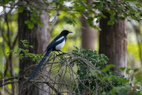 magpie, bird, nature, wildlife, animal, ornithology, pica, tree branch, tree, forest, wood, perched, avian, black, white, blue, feather, plumage, spring, summer, outdoors, day, sunlight, leaf, foliage, natural light, habitat, closeup, bokeh, blurred background, wild bird, profile, watchful, observant, calm, serene, peaceful, elegant, beautiful