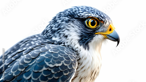 SharpEyed Falcon Portrait Blue and White Feathers Against a White Background