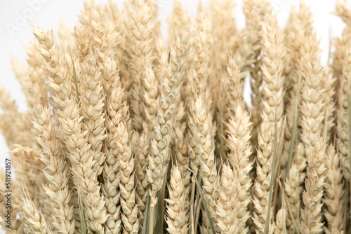 Sheaf of ripe ears of wheat. Spikelets close-up. Ears of golden wheat close-up. Rich harvest concept.