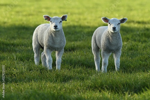 Sheep (Ovis), two lambs standing in a meadow, Texel, North Holland, Netherlands