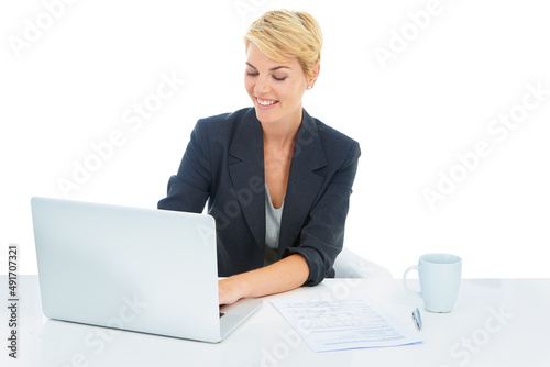 Shes happy to be at work. A young businesswoman working on her laptop.
