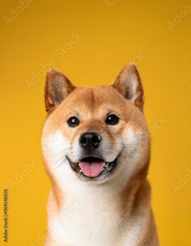 shiba inu, dog, studio shot, yellow, background, isolated, portrait, cute, pet, fluffy, playful, adorable, animal, furry, modern, closeup, minimal, design, vibrant, cheerful, happy, clean, friendly, small dog, companion, bright, simple, fun, energetic, joyful, vibrant color, lovable, isolation