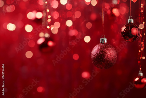 Shimmering red Christmas ornaments hang against vibrant red background, creating festive and joyful atmosphere perfect for holiday season