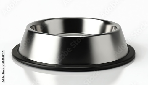 Shiny aluminum pet food bowl isolated on white background. Features sleek silver metal design with durable black rubber base. Empty, round container perfect for dog cat feeding, representing pet